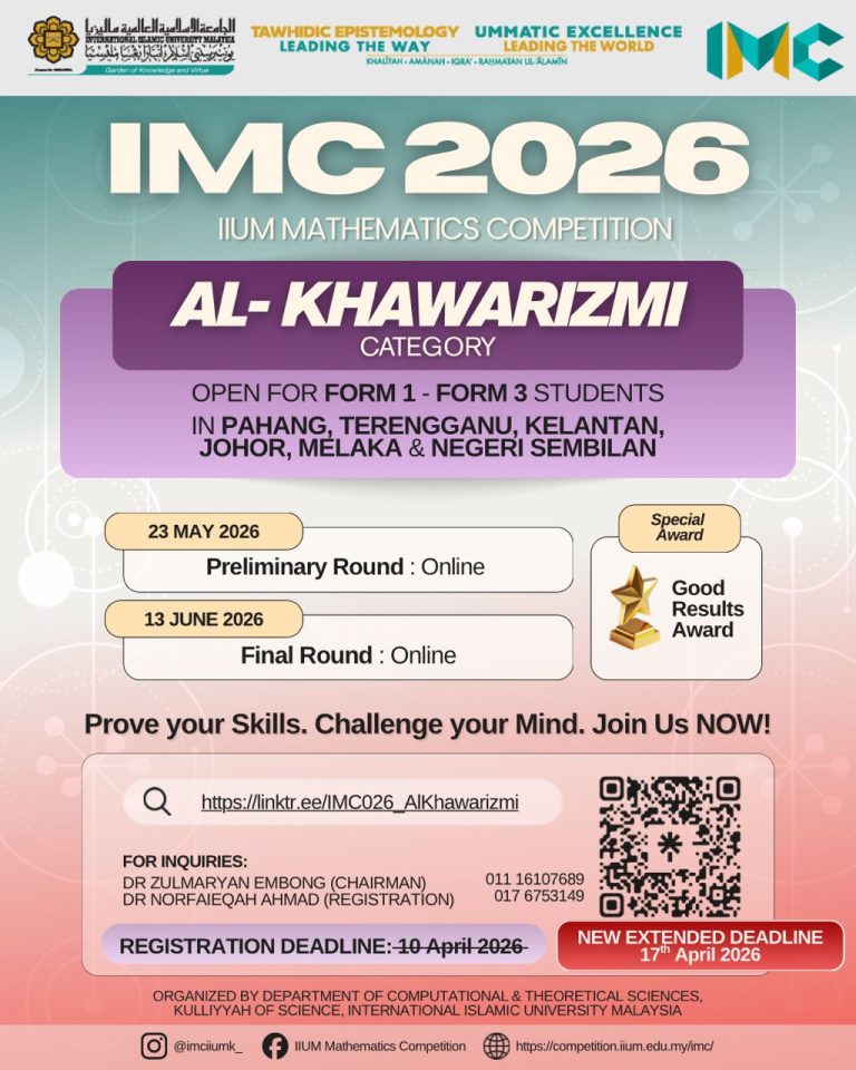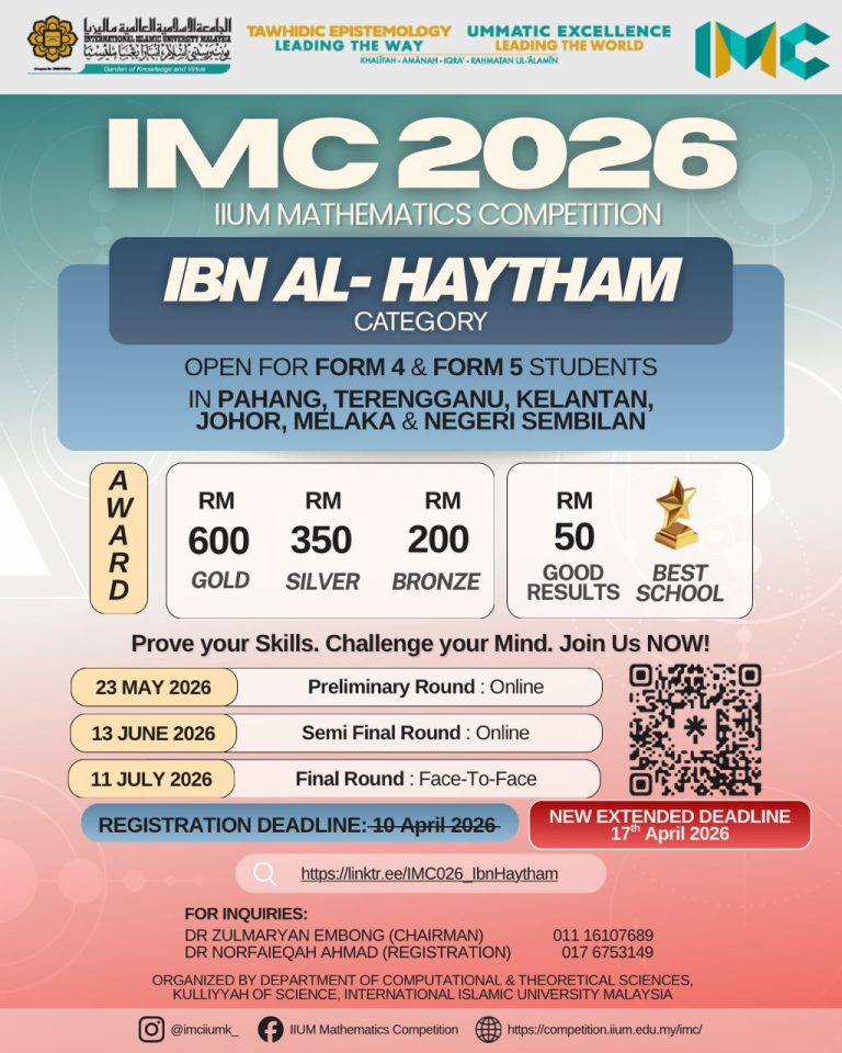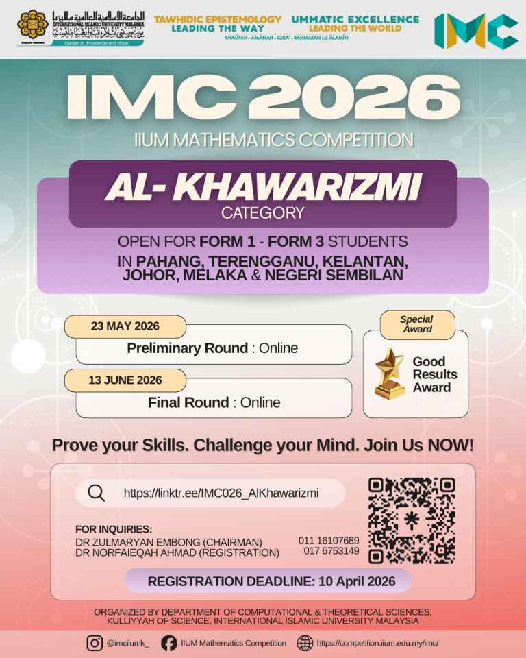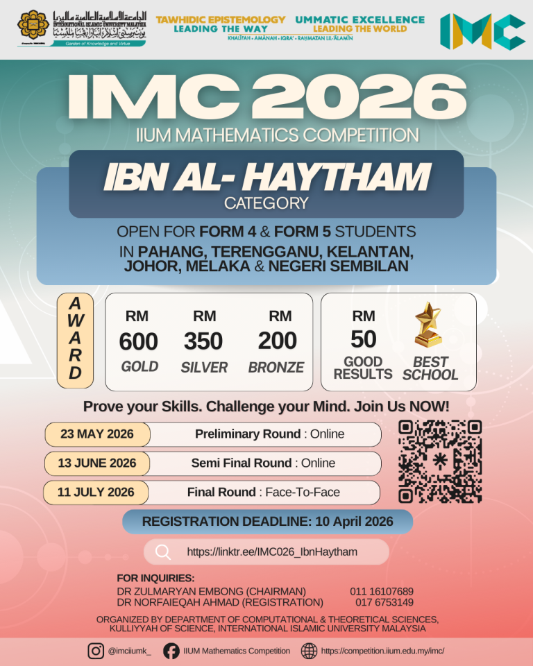 AL-KHAWARIZMI CATEGORY OPEN TO FORM 1 – FORM 3 STUDENTS IN PAHANG, TERENGGANU, KELANTAN, JOHOR, MELAKA, NEGERI SEMBILAN ONLINE COMPETITION PRELIMINARY ROUNDDate/ Day : 23rd May 2026 / Saturday Time : TBD Platform: ProProfs (Online) FINAL ROUNDDate/ Day : 13th June 2026 / Saturday Time : TBD Platform: ProProfs (Online) IBN AL-HAYTHAM CATEGORY OPEN TO FORM 4 – FORM 5 STUDENTS IN PAHANG, TERENGGANU, KELANTAN, JOHOR, MELAKA, NEGERI SEMBILAN PRELIMINARY ROUNDDate/ Day : 23rd May 2026 / Saturday Time : TBD Platform: ProProfs (Online) SEMI-FINAL ROUNDDate/ Day : 13th June 2026 / Saturday Time : TBD Platform: ProProfs (Online) FINAL ROUNDDate/ Day : 11th July 2026/ Saturday Time : TBD Location: Kulliyyah of Science, IIUM Kuantan Campus